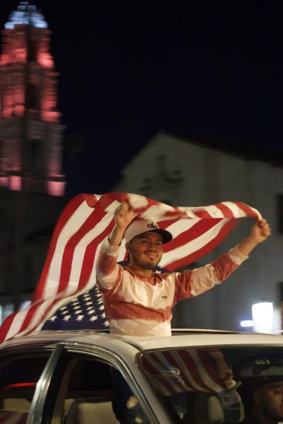 As other attendees in the distance were heard chanting in unison, “Hey, hey. Ho ho. Donald Trump has got to go!” One man was seen riding through the Downtown Riverside streets on a bike with an American flag flying behind him, his speakers blasting “FDT,” a song created by rapper YG with lyrics, “Fuck Donald Trump.”